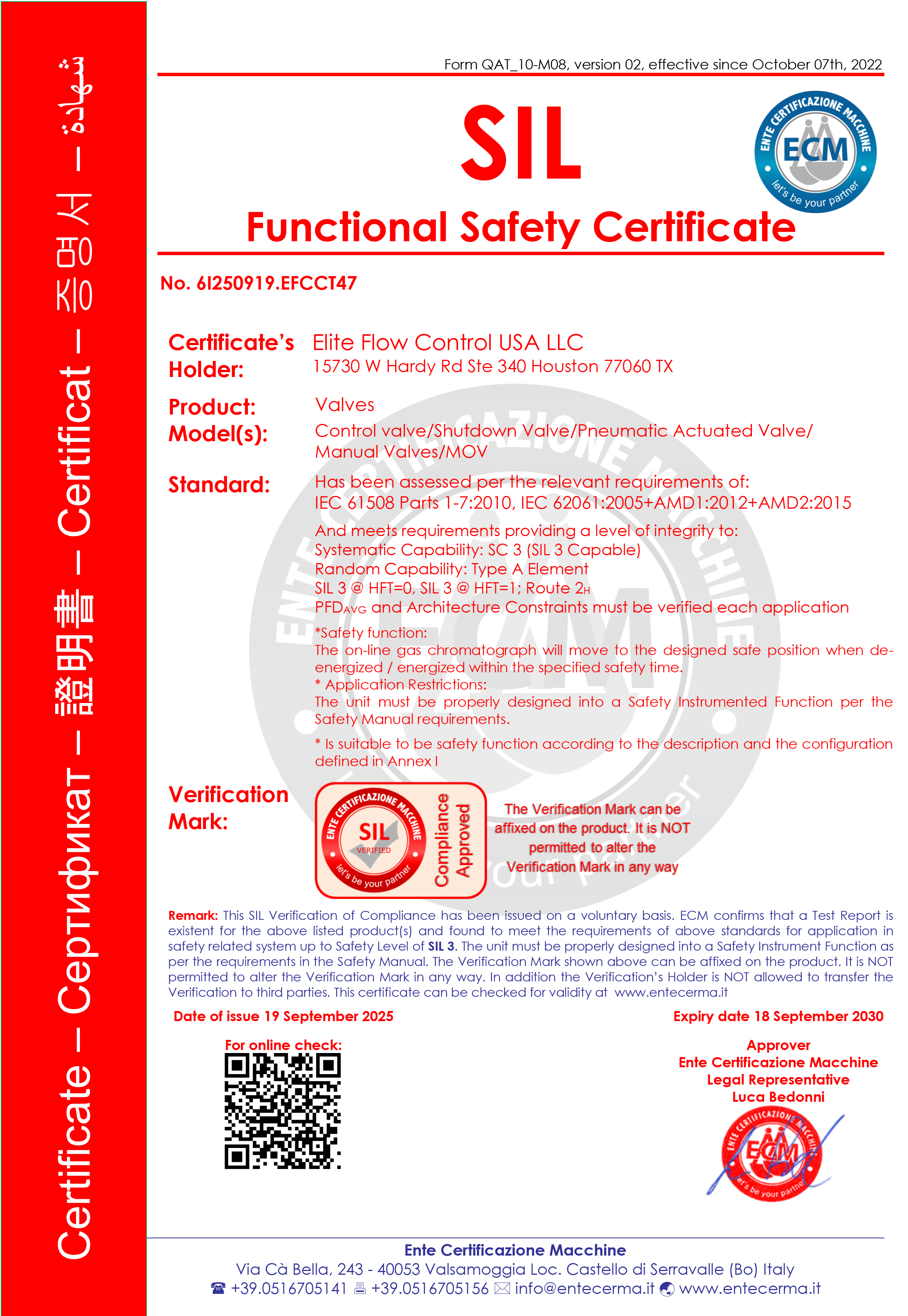By carrying SIL 3 approved products, Elite Flow Control USA LLC guarantees compliance with global safety regulations, protection of personnel and assets, and confidence that every solution contributes to the safe, sustainable, and efficient operation of your facilities.